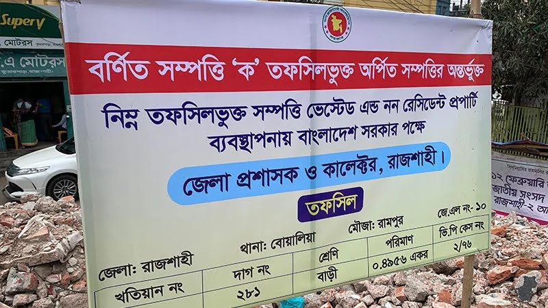 জেলা প্রশাসনের টানানো সাইনবোর্ডে জায়গাটিকে ‘ক’ তফসিলভুক্ত অর্পিত সম্পত্তি (ভেস্টেড অ্যান্ড নন-রেসিডেন্ট প্রপার্টি) হিসেবে উল্লেখ করা হয়েছে। এতে বলা হয়েছে, বাংলাদেশ সরকারের পক্ষে এই সম্পত্তির ব্যবস্থাপনার দায়িত্বে রয়েছেন রাজশাহী জেলা প্রশাসক ও কালেক্টর। জেলা প্রশাসনের টানানো ওই সাইনবোর্ডে উল্লিখিত তফসিল অনুযায়ী সম্পত্তিটির বিস্তারিত তথ্য দেওয়া হয়েছে। এর মাধ্যমে কুমারপাড়ায় অবস্থিত মহানগর আওয়ামী লীগের ওই পরিত্যক্ত জায়গাটি আনুষ্ঠানিকভাবে সরকারি সম্পত্তি হিসেবে জেলা প্রশাসনের প্রকাশ্য নিয়ন্ত্রণে এলো।