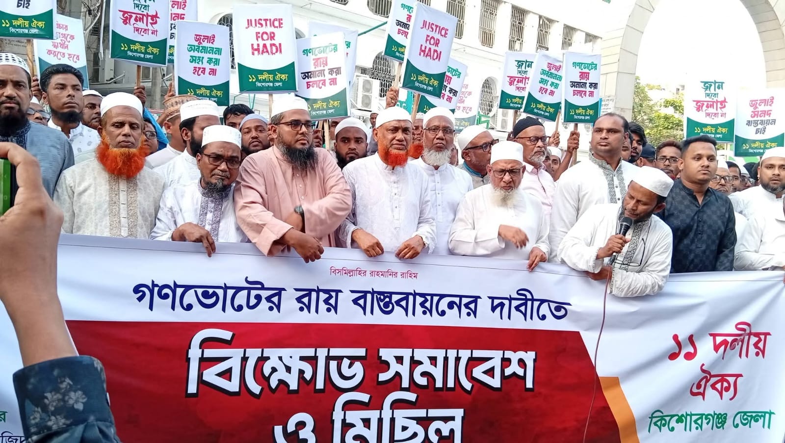রবিবার (১২এপ্রিল) বিকাল ৫টায় কিশোরগঞ্জ শহরের ঐতিহাসিক শহীদি মসজিদ চত্বর থেকে ১১ দলীয় ঐক্যের একটি বিশাল মিছিল বের হয়। মিছিলটি শহরের প্রধান সড়ক প্রদক্ষিণ করে বড়বাজার মোড়ে এসে সংক্ষিপ্ত বিক্ষোভ সমাবেশের মাধ্যমে শেষ হয়।