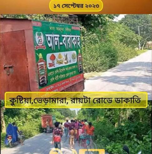সালাহউদ্দিন কানন : গতকাল ১৭ ই সেপ্টেম্বর ২০২৩ তারিখে কুষ্টিয়া, ভেড়ামারা, রাইটা রোডে আল বারাকার কাভার্ড ভ্যানটি যাত্রা পথে ডাকাতির শিকার হয়। কাভার্ড ভ্যানের চালককে গুরুতর আহত করে এবং তার কাছে থাকা টাকা পয়সা সমস্ত কিছু নিয়ে যায়।