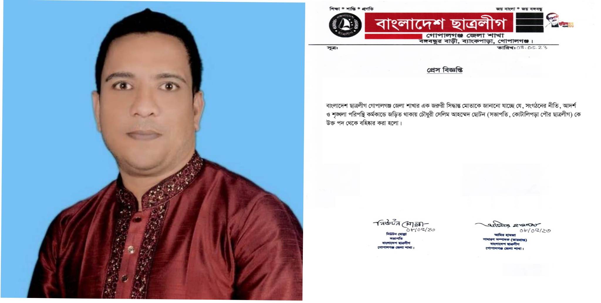 সোমবার (৮ মে) গোপালগঞ্জ জেলা শাখার ছাত্রলীগের সভাপতি নিউটন মোল্লা ও ভারপ্রাপ্ত সাধারণ সম্পাদক আমির হামজা'র স্বাক্ষরিত প্রেস বিজ্ঞপ্তিতে তাকে বহিষ্কার করা হয়।