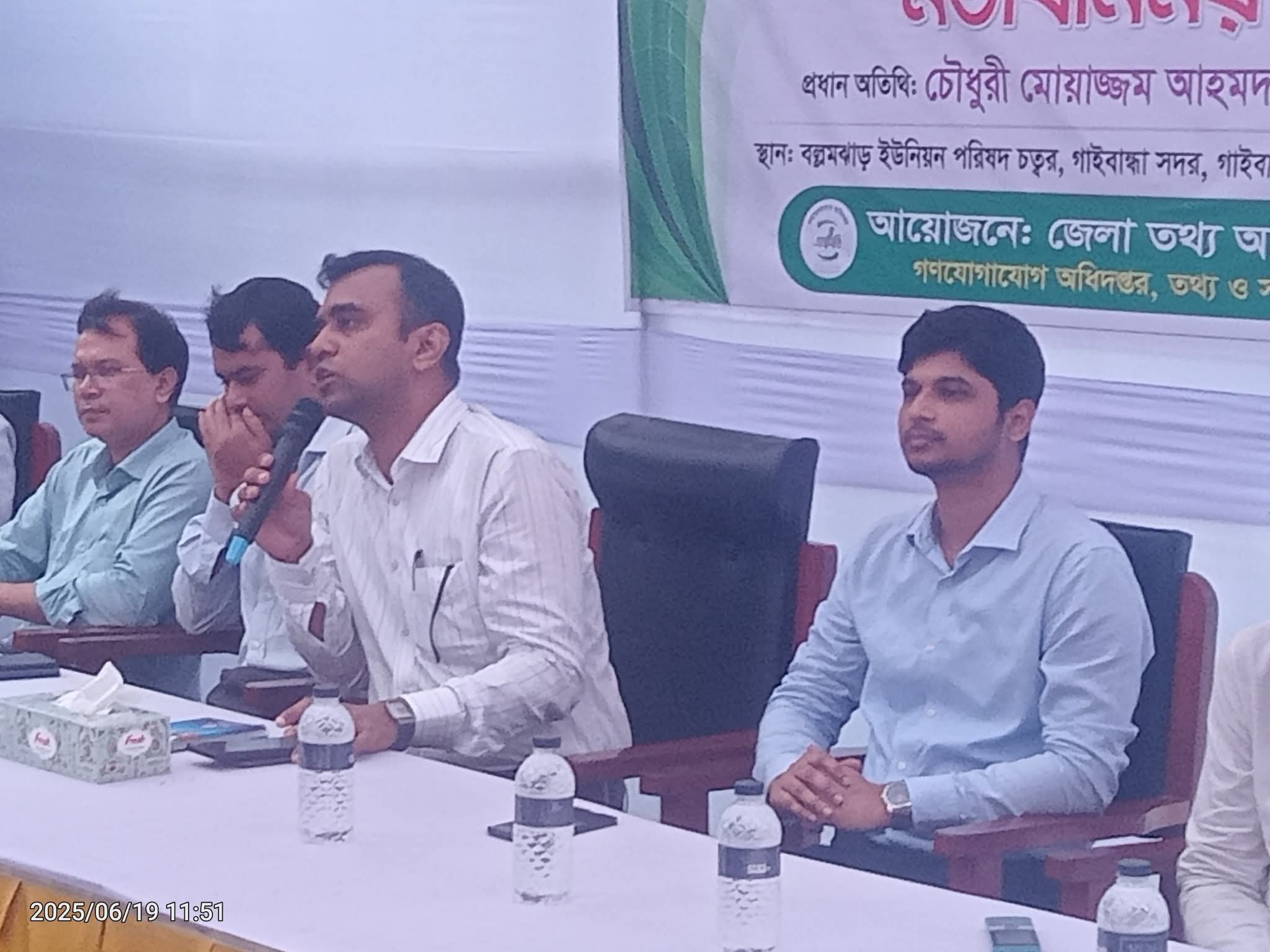 গাইবান্ধা সদর উপজেলার বল্লমঝাড় ইউনিয়ন পরিষদ চত্বরে গাইবান্ধা জেলা তথ্য অফিসের আয়োজনে আজ ১৯ জুন ২০২৫ ইং তারিখে 'জনগণের কথা' শীর্ষক এক মতবিনিময় সভা অনুষ্ঠিত হয়েছে।