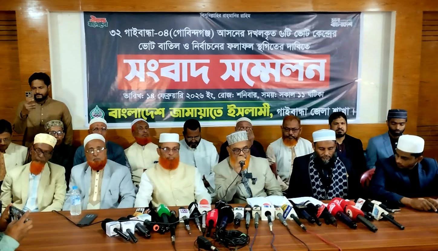 গোবিন্দগঞ্জ উপজেলার গাইবান্ধা জেলার গাইবান্ধা-৪ আসনের দখলকৃত ৫টি কেন্দ্রের ভোট বাতিল ও নির্বাচনের ফলাফল স্থগিতের দাবিতে শনিবার স্থানীয় দারুল আমান ট্রাস্টে সংবাদ সম্মেলন অনুষ্ঠিত হয়। সংবাদ সম্মেলনের আয়োজন করে বাংলাদেশ জামায়াতে ইসলামী গাইবান্ধা জেলা শাখা।