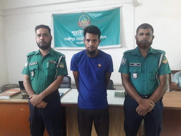 গ্রেফতারকৃত আসামী গাজীপুর জেলার পূবাইল থানার ৪১নং ওয়ার্ডের ভাদুন বাড়ইবাড়ী