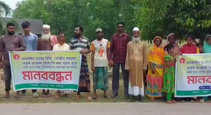 গাজীপুর সদর উপজেলার ভাওয়ালগড় ইউনিয়নের নলজানী এলাকায় ২৭ এপ্রিল শনিবার সকাল সারে ১১টায় ভাওয়াল রিসোর্টে দখল করা জমি উদ্ধারের দাবিতে মানববন্ধন করেছে ভুক্তভোগী কয়েকটি পরিবার।