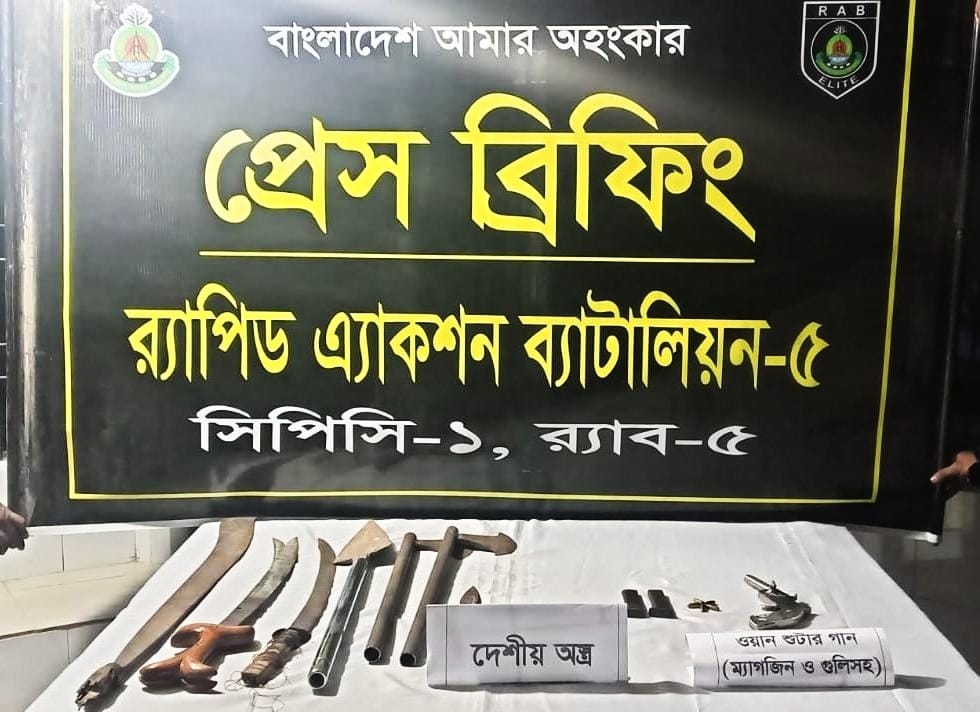 আসন্ন জাতীয় সংসদ নির্বাচনকে কেন্দ্র করে বড় ধরনের নাশকতার পরিকল্পনা নস্যাৎ করে দিয়েছে র্যাব-৫ সদস্যরা। চাঁপাইনবাবগঞ্জের গোমস্তাপুরে পরিত্যক্ত অবস্থায় একটি ওয়ান শ্যুটার পিস্তুল, ৫ রাউন্ড কার্তুজ, ২টি ম্যাগাজিন এবং ৮টি দেশীয় অস্ত্র উদ্ধার করা হয়েছে। গত শনিবার রাতে গোমস্তাপুর উপজেলার আড্ডা এলাকায় এ অভিযান চালায়। ৮ ফেব্রুয়ারি রোববার র্যাব-৫, সিপিসি-১ প্রেরিত এক প্রেস বিজ্ঞপ্তির মাধ্যমে এ তথ্য জাননো হয়। জানা গেছে, গোপন তথ্যের ভিত্তিতে জানতে পারা যায় রহনপুর-আড্ডাগামী রাস্তার পাশে নিউ রফিক অটো রাইসমিলের কাছে একটি আমগাছের ঝোপের ভেতর সন্দেহভাজন একটি প্লাস্টিকের বস্তা পড়ে আছে। এ তথ্য পাওয়ার পর রাত ১০টার দিকে র্যাব-৫, সিপিসির একটি টহল দল ঘটনাস্থলে গিয়ে তল্লাশি চালিয়ে পরিত্যক্ত অবস্থায় একটি সাদা রঙের বস্তা উদ্ধার করে। পরে বস্তা থেকে ২টি তলোয়ার, ১টি রাম দা, ১টি স্টিলের বল্লম, ২টি চাইনিজ কুড়াল, ১টি ডেগার, ১টি ওয়ান শুটার পিস্তল, ২টি ম্যাগজিনসহ ৫ রাউন্ড কার্তুজ উদ্ধার করা হয়। র্যাব সূত্রে জানা গেছে, ধারণা করা হচ্ছে উদ্ধারকৃত অস্ত্রসমূহ আসন্ন জাতীয় সংসদ নির্বাচনে অশান্তি সৃষ্টির লক্ষ্যে নাশকতা করার পরিকল্পনায় অস্থিরতা দুষ্কৃতিকারীরা এসব অস্ত্র মজুত করেছিল। সঠিক সময়ে অভিযান পরিচালনার ফলে বড় ধরনের কোনো অপ্রীতিকর ঘটনা বা নাশকতার পরিকল্পনা নস্যাৎ সম্ভব হয়েছে।