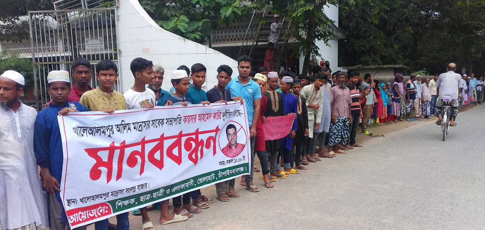 ভোলাহাট উপজেলার খালেআলমপুর দারুল সুন্নাত আলিম মাদ্রাসা ও বিজনেস ম্যানেজমেন্ট কলেজের গভর্ণিং কমিটির সাবেক সভাপতি কায়সার আহমেদ কচির নানা অনিয়ম ও দূর্নীতির বিরুদ্ধে মানববন্ধন করেছে শিক্ষার্থী ও এলাকাবাসী। সকাল ১১ টায় প্রতিষ্ঠানের প্রধান ফটকের সামনে এই মানববন্ধনের আয়োজন করে প্রতিষ্ঠানের শিক্ষক, শিক্ষার্থী ও এলাকাবাসী।
