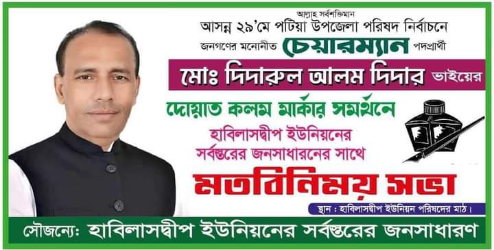 আসন্ন ২৯মে তৃতীয় ধাপের উপজেলা নির্বাচনে চট্টগ্রাম পটিয়া উপজেলার চেয়ারম্যান পদ প্রার্থী চট্টগ্রাম মহানগর যুবলীগ সিনিয়র যুগ্ম সম্পাদক সমাজসেবক শিক্ষানুরাগী মোঃ দিদারুল আলমের দোয়াত কলম মার্কার সমর্থনে আগামীকাল ১৮মে-২৪ শনিবার বিকাল ৩টা পটিয়ার ৫নং হাবিলাসদ্বীপ ইউনিয়নবাসীর সাথে এক গুরুত্বপূর্ণ মতবিনিময় সভা পটিয়ার হাবিলাসদ্বীপ ইউনিয়ন পারিষদ চত্বরে অনুষ্ঠিত হইবে।