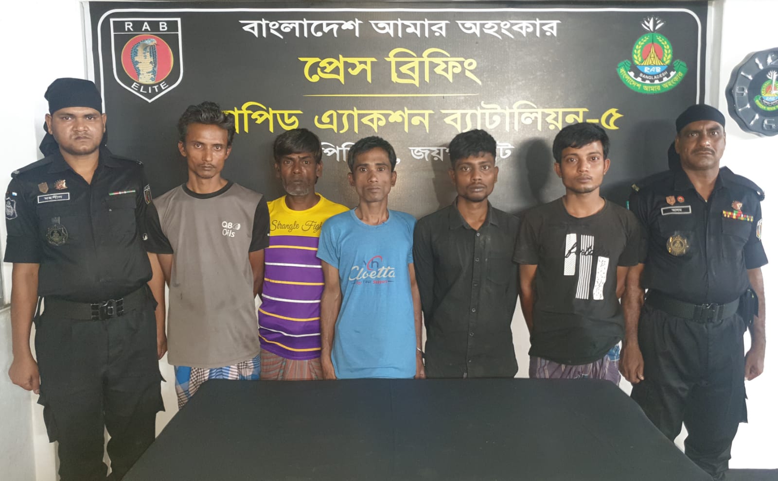 র্যাব-৫, সিপিসি-৩,জয়পুরহাটের ১টি চৌকস দল আজ সোমবার দুপুরে জয়পুরহাট সদর থানার ভাদসা গুচ্ছগ্রাম এলাকায় অভিযান চালিয়ে উক্ত গুচ্ছগ্রামের রমজান আলীর পুত্র মাদকব্যবসায়ী লিটন মিয়া (৩২), মৃত বাচ্চু মিয়ার পুত্র মনসুর আলী (৩১), আবু কাশেমের পুত্র সাধন হোসেন (২৪), নুরুল ইসলামের পুত্র সাগর হোসেন (২৬) ও শ্রী মংলা কর্মকারের পুত্র শ্রী উজ্জল কর্মকার (৪৩)কে ১৮ গ্রাম গাঁজা ও ০৬ পিচ ট্যাপেন্টাডল ট্যাবলেটসহ গ্রেফতার করে। প্রেস বিজ্ঞপ্তিতে র্যাব জানায়,গ্রেফতারকৃত আসামী লিটন চিহ্নিত মাদককারবারী। সে সীমান্তবর্তী এলাকা থেকে মাদক সংগ্রহ করে মনসুর,সাধন, সাগর ও উজ্জলের মাধ্যমে জয়পুরহাটের বিভিন্ন এলাকায় খুচরা ও পাইকারী বিক্রি করতো। এমন গোপন সংবাদের ভিত্তিতে মাদক ক্রয়-বিক্রয়ের সময় তাদের হাতেনাতে গ্রেফতার করা হয়। এ ব্যাপারে জয়পুরহাট সদর থানায় মাদকদ্রব্য নিয়ন্ত্রণ আইন ২০১৮ অনুযায়ী ভীত আসামিদের সোপর্দপূর্বক একটি মামলা দায়ের করা হয়েছে।