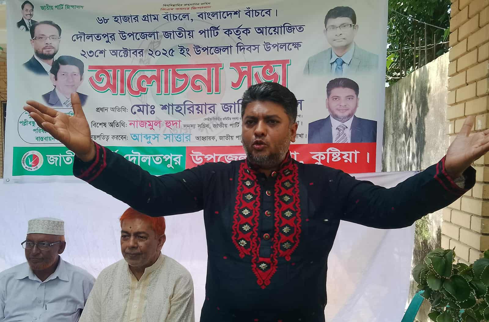 দৌলতপুর উপজেলা জাতীয় পার্টির আহ্বায়ক আব্দুর সাত্তারের সভাপতিত্বে আলোচনা সভায় প্রধান অতিথি হিসেবে উপস্থিত ছিলেন কুষ্টিয়া জেলা জাতীয় পার্টির সাধারণ সম্পাদক ও সাবেক খাদ্য প্রতিমন্ত্রী কোরবান আলীর ছেলে শাহরিয়ার জামিল জুয়েল।