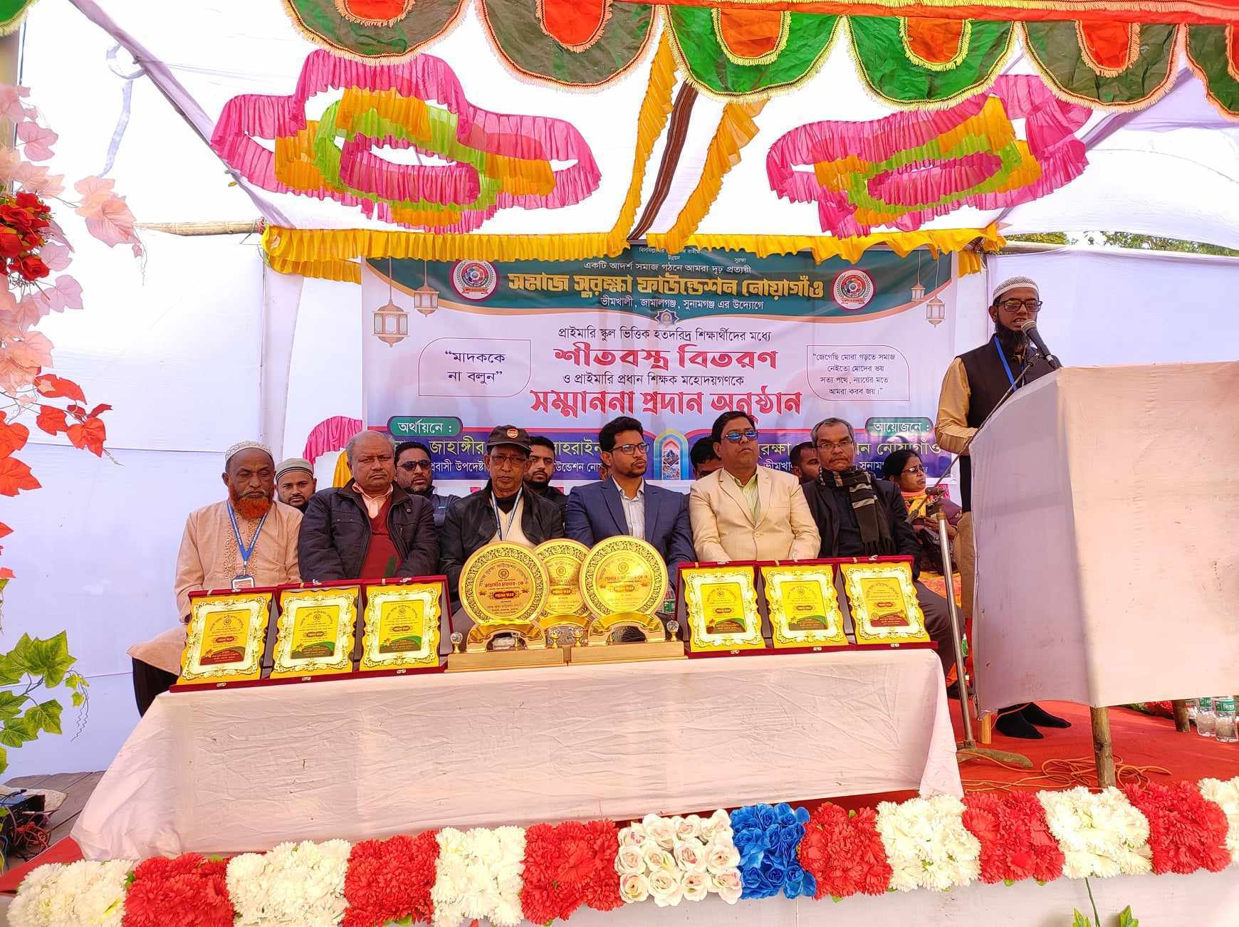 "একটি আদর্শ সমাজ গঠনে আমরা দৃঢ় প্রত্যয়ী" এই প্রতিপাদ্য কে সামনে রেখে সুনামগঞ্জের জামালগঞ্জ উপজেলার ভীমখালী ইউনিয়নের নোয়াগাঁও বাজারে "সমাজ সুরক্ষা ফাউন্ডেশন এর উদ্যোগে প্রাইমারি স্কুল ভিত্তিক দরিদ্র ১৪০ জন শিক্ষার্থীদের মধ্যে শীতবস্ত্র বিতরণ ও ৬ জন প্রধান শিক্ষক কে সম্মাননা প্রদান করা হয়েছে।