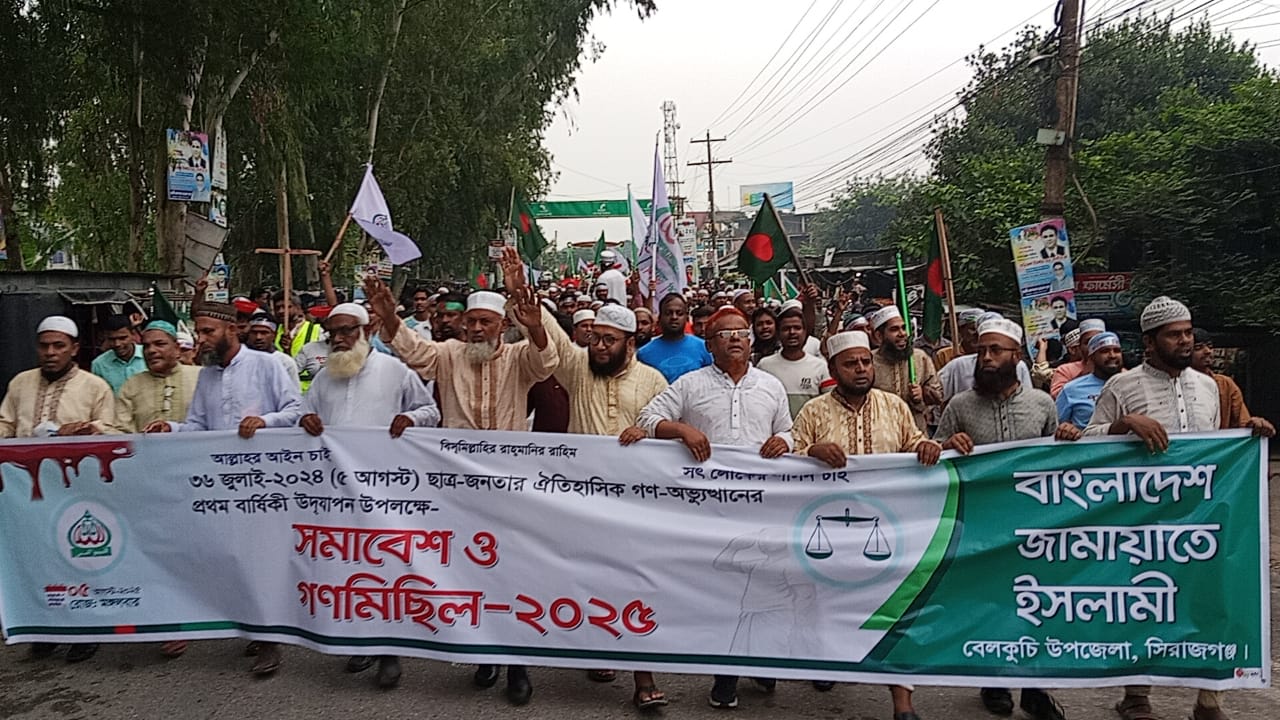 জুলাই গণঅভ্যুত্থানের প্রথম বার্ষিকী উপলক্ষ্যে সিরাজগঞ্জের বেলকুচিতে সমাবেশ ও গণমিছিল করেছেন বাংলাদেশ জামায়াতে ইসলামী বেলকুচি উপজেলা শাখা।