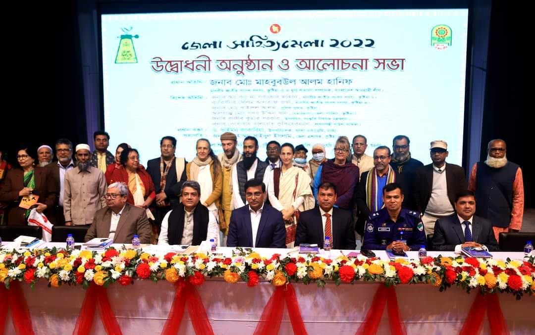 অদ্য ১৩ জানুয়ারি ২০২৩/২৯ পৌষ ১৪২৯, শুক্রবার জেলা শিল্পকলা একাডেমি মিলনায়তন, কুষ্টিয়াতে জেলা সাহিত্য মেলা-২০২২ এর উদ্বোধনী অনুষ্ঠান ও আলোচনা সভা অনুষ্ঠিত হয়। উক্ত অনুষ্ঠানে প্রধান অতিথি হিসেবে উপস্থিত ছিলেন জনাব মোঃ মাহবুবউল আলম হানিফ মাননীয় জাতীয় সংসদ সদস্য, কুষ্টিয়া-৩ ও যুগ্ম সাধারণ সম্পাদক, বাংলাদেশ আওয়ামী লীগ। বিশেষ অতিথি হিসেবে উপস্থিত ছিলেন জনাব আঃ কাঃ মঃ সরওয়ার জাহান, মাননীয় জাতীয় সংসদ সদস্য, কুটিয়া-১; ব্যারিস্টার সেলিম আলতাফ জর্জ, মাননীয় জাতীয় সংসদ সদস্য, কুষ্টিয়া-৪; জনাব মোঃ খাইরুল আলম, পুলিশ সুপার, কুষ্টিয়া; জনাব রাজীব কুমার সরকার, উপসচিব, সংস্কৃতি বিষয়ক মন্ত্রণালয়, জনাব দেবোরাহ এলিয়েত কুকিয়েরম্যান, লালনপন্থী বাউল সাধিকা। প্রধান বক্তা ছিলেন ড. সাইমন জাকারিয়া, উপপরিচালক, বাংলা একাডেমি, ঢাকা।