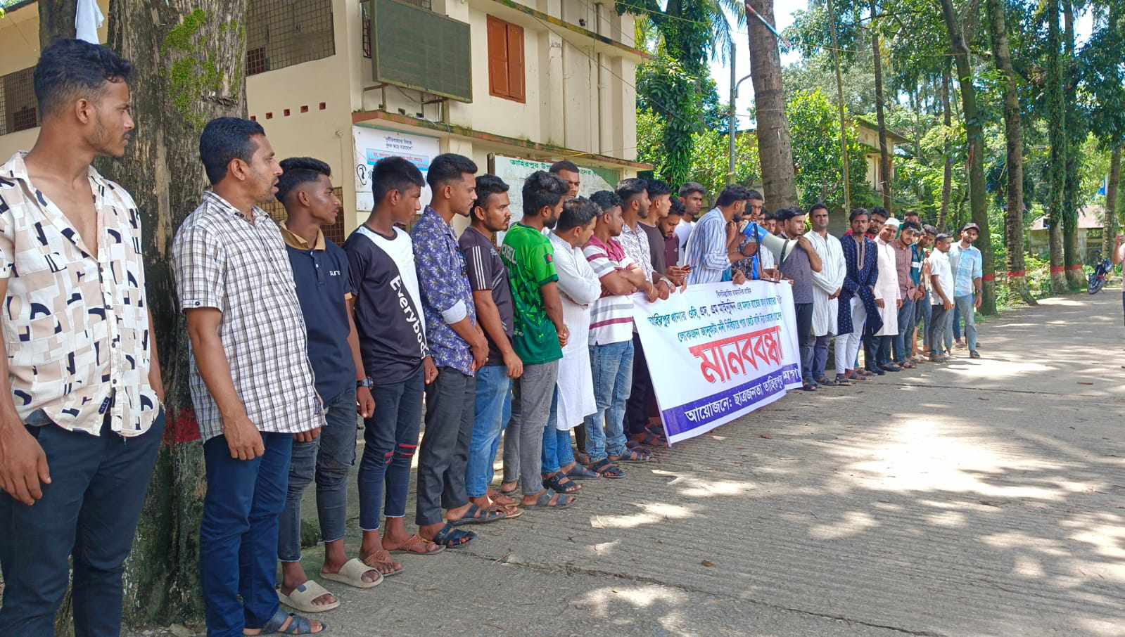 সুনামগঞ্জের তাহিরপুর থানার ওসি মাইন উদ্দিনের অপসারণের দাবিতে মানববন্ধন করেছে ছাত্রজনতা।