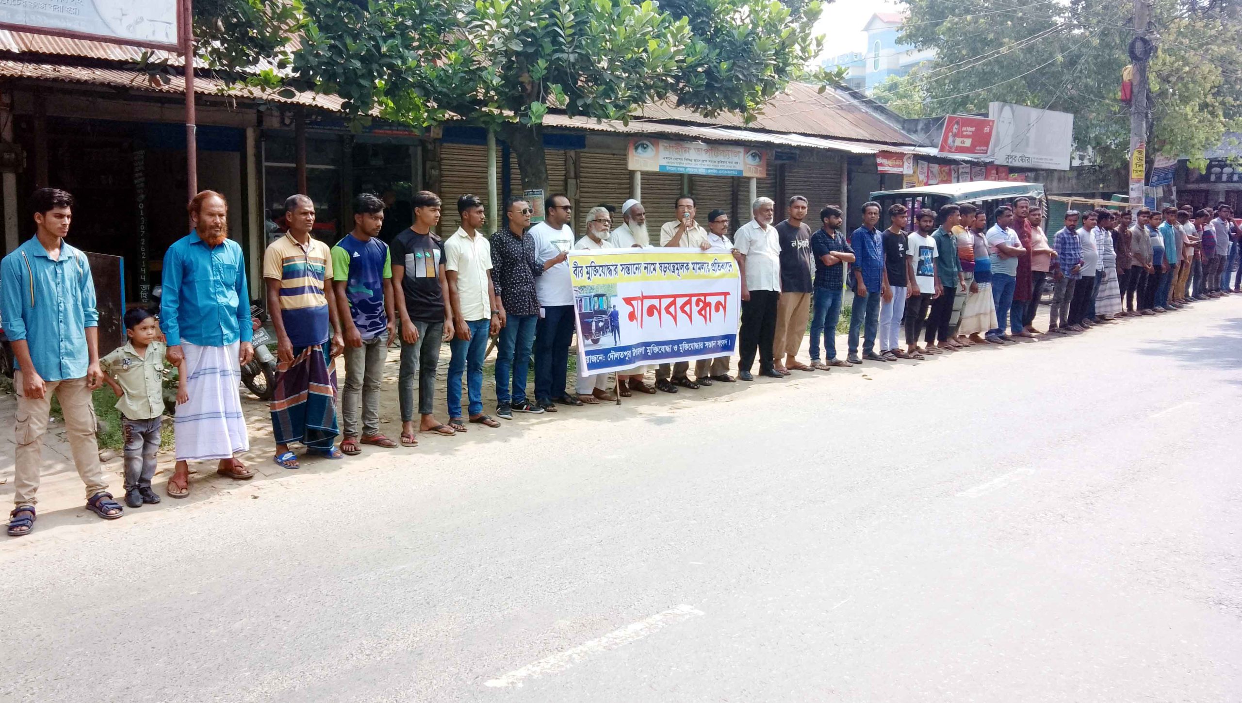 কুষ্টিয়ার দৌলতপুরে বীর মুক্তিযোদ্ধা কাউছার আলী বিশ্বাস এর সন্তান রকিবুল হাসান রাজন সহ তার তিন ভাইয়ের বিরুদ্ধে ষড়যন্ত্রমুলক ও মিথ্যা মামলার প্রতিবাদে দৌলতপুর উপজেলা বীর মুক্তিযোদ্ধা, মুক্তিযোদ্ধা সন্তান ও প্রজন্ম সংসদের ব্যানারে মানববন্ধন অনুষ্ঠিত হয়েছে।