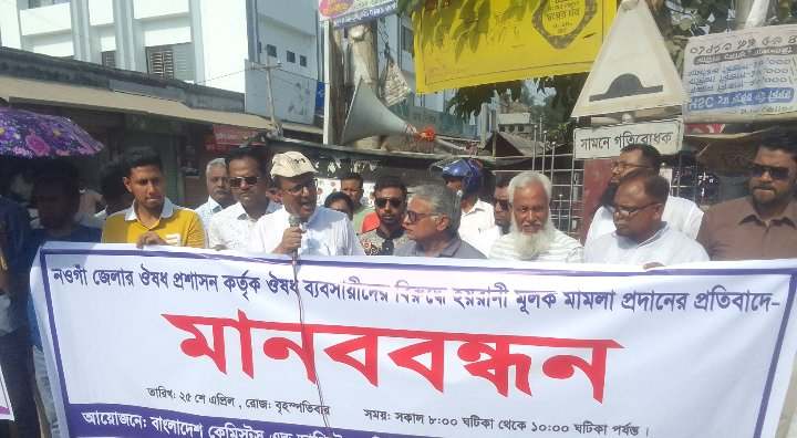 নওগাঁয় ওষুধ প্রশাসন কর্তৃক ওষুধ ব্যবসায়ীদের বিরুদ্ধে হয়রানি মূলক মামলার প্রতিবাদে মানববন্ধন,