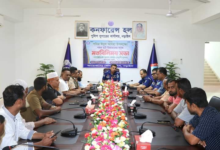 নড়াইল জেলা পুলিশ সুপারের কার্যালয়, কনফারেন্স রুমে পবিত্র ঈদুল আযহা উপলক্ষে পশুর হাট ইজারাদের সাথে এক মতবিনিময় সভার আয়োজন করা হয়। উজ্জ্বল রায়, নড়াইল জেলা প্রতিনিধি জানান,গত মঙ্গলবার (৪ জুন)