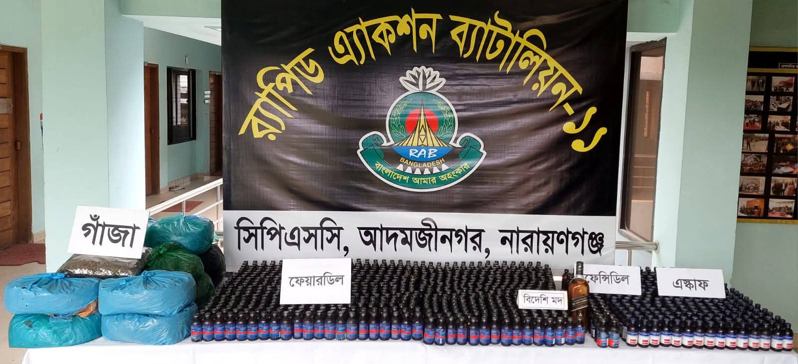 মাদকদ্রব্য নির্মূলে ও মাদকের ভয়াল থাবা থেকে যুব সম্প্রদায়কে রক্ষা করতে নারায়ণগঞ্জ র্যাব-১১ বদ্ধপরিকর এবং এ লক্ষ্যে র্যাব-১১ নিরলস ভাবে কাজ করে যাচ্ছে। মাদক নির্মূলের লক্ষ্যে র্যাব-১১ নিয়মিত অভিযান পরিচালনা করে আসছে এবং বিভিন্ন সময়ে র্যাব-১১ বিপুল পরিমান মাদক উদ্ধারসহ মাদক ব্যবসার সাথে জড়িতদেরকে গ্রেফতার পূর্বক আইনের আওতায় নিয়ে আসছে। এরই ধারাবাহিকতায় গোপন সংবাদের ভিত্তিতে র্যাব-১১, সিপিএসসি, নারায়ণগঞ্জ এর একটি চৌকস আভিযানিক দল শনিবার (৪ এপ্রিল ২০২৬) তারিখ রাত ০৪.৩০ ঘটিকার সময় নারায়ণগঞ্জ জেলার সোনারগাঁও থানাধীন কাঁচপুর ইউনিয়ন পরিষদের চেঙ্গাইল এলাকা হতে ১০২৩ বোতল ফেনসিডিল ও স্কাফ, ২৬ কেজি গাঁজা , এক বোতল বিদেশী মদসহ দুই জন মাদক ব্যবসায়ীকে গ্রেফতার করতে সক্ষম হয়। এই সময় মাদক পরিবহনের কাজে ব্যবহৃত একটি সিএনজি নারায়ণগঞ্জ থ ১১ - ১৮৬২ এবং দুইটি মোটরসাইকেল জব্দ করা হয়। গ্রেফতারকৃত আসামি হলো ১। সুজন মোল্লা (২১), পিতা-মৃত ওয়াদুদ মোল্লা, সাং- ভন্ডবাসা, থানাঃ বোয়ালমারী, জেলাঃ ফরিদপুর ২। জাবেদ (৩৫), পিতাঃ মৃত নাসির উদ্দিন, সাং- বাসটেকি, থানাঃ সোনারগাঁও, জেলা: নারায়ণগঞ্জ।