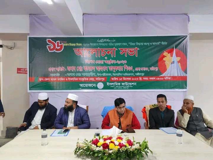 ইসলামী ফাউন্ডেশন ফরিদপুরের উপ- পরিচালক মোঃ শাহাবুদ্দিনের সভাপতিত্বে শহরের পুরাতন বাসস্ট্যান্ড সংলগ্ন জেলা মডেল মসজিদ প্রাঙ্গনে মহান বিজয় দিবসের গুরুত্ব ও তাৎপর্য শীর্ষক এ আলোচনা সভা অনুষ্ঠিত হয়।