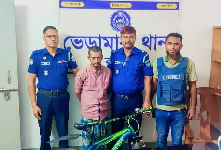 আজ মঙ্গলবার দুপুরে কুষ্টিয়া পুলিশ সুপারের নির্দেশে সহকারী পুলিশ সুপার, মিরপুর সার্কেল, (অতিরিক্ত দ্বায়িত্ব ভেড়ামারা সার্কেল) কুষ্টিয়া এর সার্বক্ষণিক তদারকি ও দিক নির্দেশনায় অফিসার ইনচার্জ, ভেড়ামারা থানা, কুষ্টিয়া’র সার্বিক তত্ত্ববধানে এসআই (নিরস্ত্র)/মোঃ শিমরুল হাসান ও অন্যান্য ফোর্স নিয়ে গোপন সংবাদের ভিত্তিতে আজ দুপুরে অভিযান চালিয়ে গোলাপনগর মাজার সংলগ্ন থেকে সাইকেল চোর হৃদয় (২৭) কে সাইকেল সহ আটক করে।