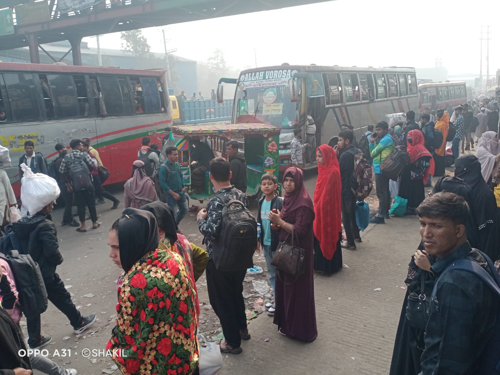 হাসান, যাত্রী জানান, ঢাকা থেকে চন্দ্রা যেতে যেখানে সাধারণত বাসভাড়া ১৫০ থেকে ২৫০ টাকা, সেখানে ৪৫০ থেকে ৫০০ টাকা পর্যন্ত আদায় করা হচ্ছে। বাস না পেয়ে অনেক যাত্রী বাধ্য হয়ে ট্রাকেও উঠছেন। ট্রাকে জনপ্রতি নেওয়া হচ্ছে ২০০ থেকে ৩০০ টাকা।