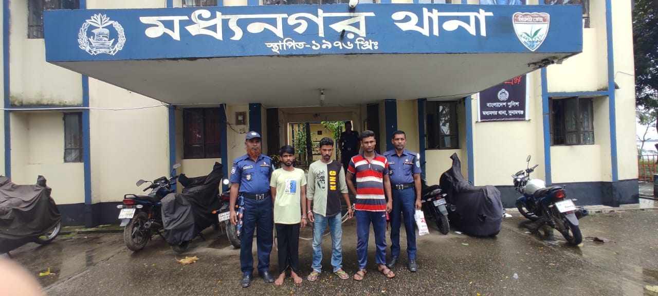 সুনামগঞ্জের মধ্যনগরে ৩ চোরাকারবারিকে আটক করেছে মধ্যনগর থানা পুলিশ। সোমবার (১৩ আগস্ট) ভোররাতে বিশেষ অভিযান চালিয়ে মধ্যনগর থানাধীন দক্ষিণ বংশীকুন্ডা ইউনিয়নের জয়পুর নিকটস্থ একটি ব্রীজ থেকে তাদেরকে আটক করা হয়েছে।আটককৃতরা হল মধ্যনগর উপজেলার মির্জাপুর গ্রামের মো.মিরাজ আলীর ছেলে মো.নূর আলী(৩৫), একই গ্রামের মৃত আব্দুল মালেকের ছেলে মো.মহসিন আলী(৩৫),চান্দালীপাড়া গ্রামের মৃত আঃ বারেকের ছেলে মোঃ আলী হোসেন (৪৩)।এসআই মোঃ মশিউর রহমান,এএসআই মোঃ আব্দুল আজীম সঙ্গীয় ফোর্স বিশেষ অভিযান চালিয়ে তাদের আটক করেন।