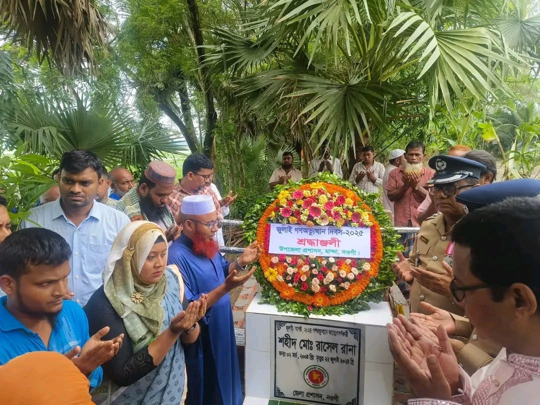 এ দিবস উপলক্ষে মঙ্গলবার ৫ আগষ্ট (৩৬জুলাই) সকালে শহিদ রাসেলের কবর জিয়ারত, পুষ্পস্তবক অর্পণ, বিশেষ দোয়া মাহফিল ও আলোচনা সভার আয়োজন করে মান্দা উপজেলা প্রশাসন। কর্মসূচিতে মান্দা উপজেলা নির্বাহী অফিসার আখতার জাহান সাথী প্রধান অতিথি হিসেবে উপস্থিত ছিলেন। এছাড়াও উপস্থিত ছিলেন মান্দা সার্কেলের সহকারী পুলিশ সুপার জাকিরুল ইসলাম, মান্দা থানার অফিসার ইনচার্জ (ওসি) মুনসুর রহমান, উপজেলা প্রাণিসম্পদ কর্মকর্তা ডা. নুরুজ্জামান, উপজেলা সমাজসেবা কর্মকর্তা মো. শাকিল আহমেদ, বিভিন্ন দপ্তরের কর্মকর্তা, রাজনৈতিক নেতৃবৃন্দ ও স্থানীয় গণ্যমান্য ব্যক্তিবর্গ। সকালেই শহিদ রাসেলের কবর জিয়ারতের মাধ্যমে দিনের কর্মসূচি শুরু হয়। এরপর উপজেলা প্রশাসনের পক্ষ থেকে পুষ্পস্তবক অর্পণ ও শ্রদ্ধা নিবেদন করা হয়। শহিদের বিদেহী আত্মার শান্তি ও মাগফিরাত কামনা করে বিশেষ দোয়া মাহফিল অনুষ্ঠিত হয়।পরে সংক্ষিপ্ত আলোচনায় উপজেলা নির্বাহী অফিসার আখতার জাহান সাথী বলেন, “শহিদ রাসেলসহ যারা এই আন্দোলনে আত্মত্যাগ করেছেন, তাঁদের মহান ত্যাগকে স্মরণ করে আমাদের নতুন প্রজন্মকে দেশপ্রেমে উদ্বুদ্ধ করতে হবে। তাঁদের আদর্শে অনুপ্রাণিত হয়ে সকলকে দেশের কল্যাণে একযোগে কাজ করতে হবে।” অনুষ্ঠান শেষে স্থানীয় জনসাধারণ ও অংশগ্রহণকারীদের মধ্যে মিষ্টি বিতরণ করা হয়। দিবসটির গুরুত্ব তুলে ধরে অন্যান্য বক্তারা বলেন, ‘জুলাই অভ্যুত্থান’ আমাদের গণতান্ত্রিক চেতনাকে শক্তিশালী করেছে। শহিদদের রক্তের ঋণ শোধ করতে সৎ ও ন্যায়নিষ্ঠ সমাজ গড়তে হবে।’ আয়োজনে স্থানীয় স্কুল-কলেজের শিক্ষার্থী, বিভিন্ন স্বেচ্ছাসেবী সংগঠন ও সাংবাদিকরাও উপস্থিত ছিলেন।দীর্ঘদিন পর এই দিবসটি নতুন করে স্মরণ করে এলাকাবাসীর মধ্যে ভিন্নরকম আবেগ ও প্রত্যয় দেখা যায়।