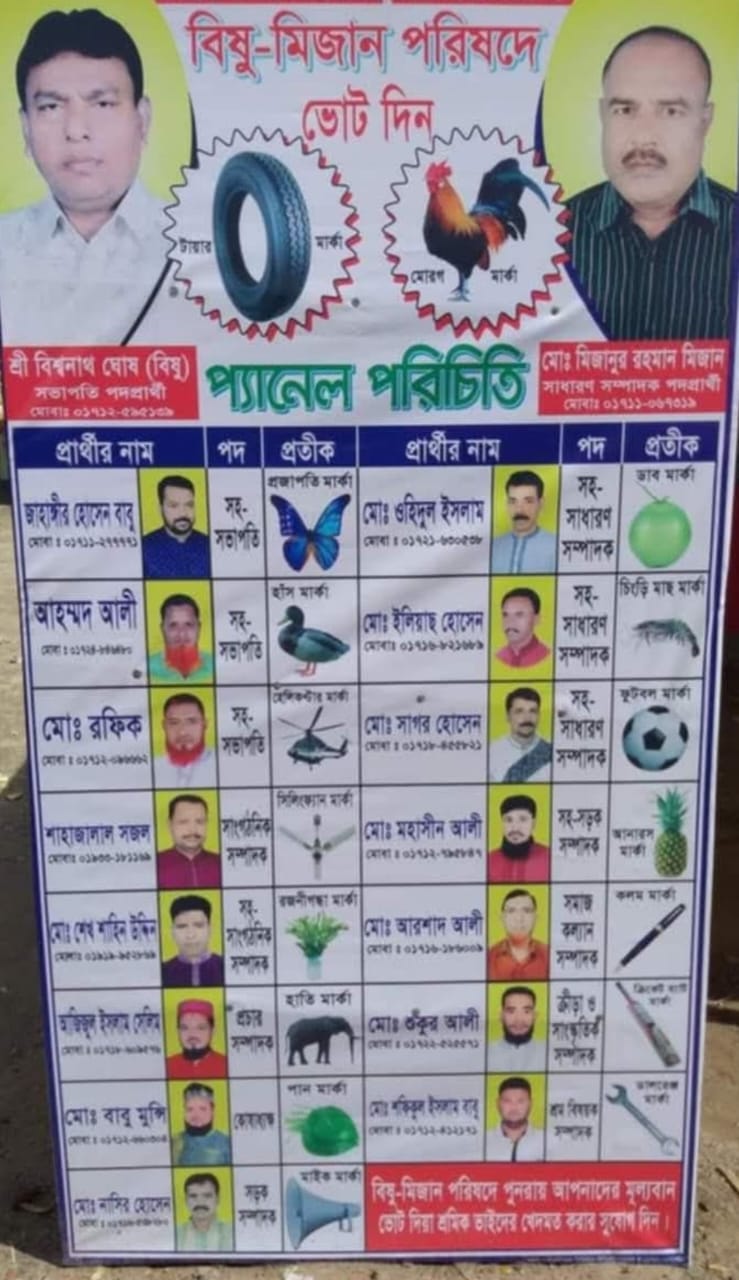 এই বিষু-মিজান নেতৃত্বাধীন প্যানেলের প্রার্থীরা হলেন, সভাপতি পদে বিস্বনাথ ঘোষ বিষু, সহ-সভাপতি ৩টি পদে রফিকুল ইসলাম, আহমদ আলী ও জাহাঙ্গীর হোসেন বাবু, সাধারণ সম্পাদক মিজানুর রহমান, সহ-সাধারণ সম্পাদক ৩টি পদে ওহিদুল ইসলাম, ইলিয়াস হোসেন ও সাগর হোসেন, সাংগঠনিক সম্পাদক শাহজালাল সজল, সহ-সাংগঠনিক সম্পাদক শাহীন উদ্দিন শেখ, প্রচার সম্পাদক আজিজুল ইসলাম সেলিম, কোষাধ্যক্ষ মো. বাবু, সড়ক সম্পাদক নাছির উদ্দিন, সহ-সড়ক সম্পাদক মহসীন আলী, সমাজ কল্যাণ সম্পাদক আরশাদ আলী, ক্রীড়া ও সাংস্কৃতিক সম্পাদক শুকুর হোসেন রনি এবং শ্রম বিষয়ক সম্পাদক পদে শফিকুল ইসলাম বাবু। এছাড়া শ্রম বিষয়ক সম্পাদক পদে স্বতন্ত্র প্রার্থী হয়েছেন রুস্তম আলী। এই পদ ব্যাতিরেকে সকল পদে বিরোধী পরিষদের প্রার্থী যথারীতি রয়েছে।