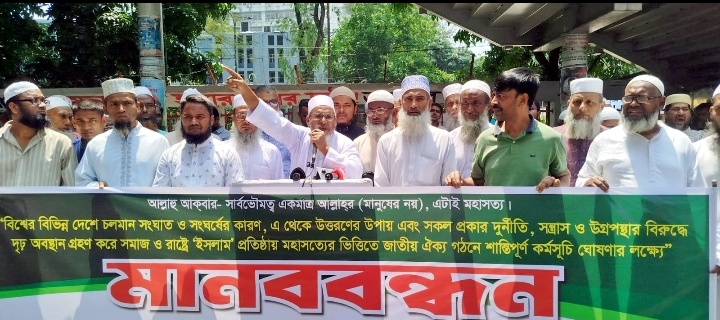 ইসলামী সমাজের আমীর হজরত সৈয়দ হুমায়ূন কবীর বলেছেন, বাংলাদেশসহ বিশ্বের প্রতিটি দেশে রাজনীতির নামে মানুষে মানুষে প্রতিহিংযার আগুন জ্বলছে। ক্ষমতা ও আধিপত্য বিস্তারকে কেন্দ্র করে মানুষ দলে উপদলে বিভক্ত হয়ে সংঘাত ও সংঘর্ষে জড়িয়ে মহা বিপর্যয়ের দিকে ধাবিত হচ্ছে। বর্তমানে ইরান ও ফিলিস্তিনের সাথে ইজরাইল ও আমেরিকার সংঘর্ষের কারণে বাংলাদেশসহ গোটা বিশ্বের মানুষ চরম সংকটকাল অতিক্রম করছে। আমাদের প্রিয় মাতৃভূমি বাংলাদেশে দুর্নীতি, সন্ত্রাস, চাঁদাবাজি, ছিনতাই, জালানি সংকট, নারী ও শিশু নির্যাতন এবং মানুষ হত্যাসহ মানবতা বিরোধী অপরাধের মাত্রা চরম আকার ধারন করেছে। মানুষ মানবতা, মনুষত্ব হারিয়ে হিংস্রতা ও পশুত্বের অতল গহ্বরে নিজজ্জিত হয়ে আছে। মানুষের সার্বভৌমত্ব এবং আলকুরআন বিরোধী সংবিধানই সমাজ ও রাষ্ট্রের সকল সমস্যার মূল সমস্যা এ কথার উল্লেখ করে তিনি বলেন, আলকুরআন বিরোধী সংবিধান মানুষকে মানুষের সার্বভৌমত্ব ও মানুষের মনগড়া আইনের আনুগত্যের অধীনে বন্দি করে মহান রবের সাথে শিরক ও কুফরে নিমজ্জিত করেছে। তিনি বলেন, কুফর এবং শির্ক করার কারণে আল্লাহ রাব্বুল আলামীনের আযাব-গজবের অংশ হিসেবেই বিশ্বব্যাপী মানুষে মানুষে সংঘাত ও সংঘর্ষের মাত্রা বৃদ্ধি পাচ্ছে। 'ইসলামী সমাজ' ঢাকা মহানগর দক্ষিণ এর সহকারী দায়িত্বশীল আবু জাফর মোহাম্মাদ সালেহ'র সঞ্চালনায় (৭ এপ্রিল মঙ্গলবার) সকাল ১১টায় জাতীয় প্রেসক্লাবের সামনে "বিশ্বের বিভিন্ন দেশে চলমান সংঘাত ও সংঘর্ষের কারণ, এ থেকে উত্তরণের উপায় এবং সকল প্রকার দুর্নীতি, সন্ত্রাস ও উগ্রপন্থার বিরুদ্ধে দৃঢ় অবস্থান গ্রহণ করে সমাজ ও রাষ্ট্রে 'ইসলাম' প্রতিষ্ঠায় মহাসত্যের ভিত্তিতে জাতীয় ঐক্য গঠনে শান্তিপূর্ণ কর্মসূচি ঘোষণার লক্ষ্যে" অনুষ্ঠিত মানববন্ধনে ইসলামী সমাজের আমীর বলেন, দেশ স্বাধীনের ৫৪ বছরে বিভিন্ন সময়ে যারাই ক্ষমতায় এসেছেন তারা সকলেই আল কুরআন বিরোধী মানব রচিত ব্যবস্থা গণতন্ত্র দিয়ে সমাজ ও রাষ্ট্র গঠন এবং পরিচালনা করেছে। বর্তমানে যারা ক্ষমতায় আছে তারাও গণতন্ত্রের ভিত্তিতে রচিত আল কুরআন বিরোধী সংবিধান দিয়ে রাষ্ট্র চালাচ্ছেন। তিনি বলেন, দেশে রাজনীতির নামে মানবাধিকার চরমভাবে লঙ্ঘিত হচ্ছে এবং মানুষের জীবনে নৈরাজ্য চলছে। বাংলাদেশসহ বিশ্বের চলমান সকল সংকট থেকে বাঁচতে হলে গণতন্ত্রের ভিত্তিতে রচিত আলকুরআন বিরোধী সংবিধানের মূলোৎপাটন করে সকল ধর্মের লোকদের জন্য যার যার ধর্ম পালনের সুযোগ রেখে সমাজ ও রাষ্ট্রে আল্লাহর রাসুল হযরত মুহাম্মাদ (সা:) এর প্রদর্শিত পদ্ধতিতে 'ইসলাম' প্রতিষ্ঠা করতে হবে। তিনি আরও বলেন, গণতন্ত্রের অধীনে জোট, ভোট-নির্বাচন কিংবা সশ্রস্ত্র লড়াই 'ইসলাম' প্রতিষ্ঠায় আল্লাহর নির্দেশিত এ