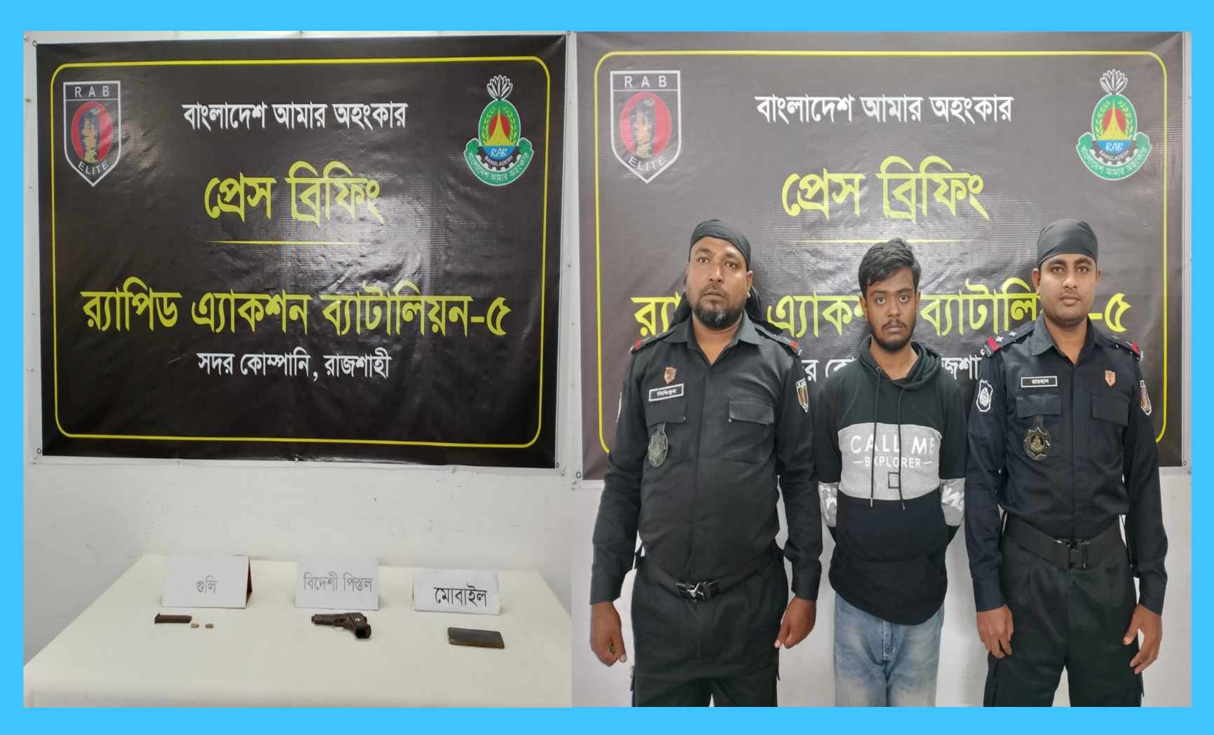 উল্লেখ্য, উপরোক্ত ঘটনায় র্যাপিড এ্যাকশন ব্যাটালিয়ন (র্যাব) এর বিরতিহীন চলমান অভিযানে সিপিএসসি, র্যাব-৫ রাজশাহী কতৃক র্যাবের অভিযানে বিদেশি পিস্তল, ম্যাগজিন ও ০২ রাউন্ড গুলি উদ্ধার পূর্বক ০১ অস্ত্র কারবারীকে গ্রেফতারের বিষয়টি আজ মঙ্গলবার (২৭ নভেম্বর, ২০২৩ ইং) সিপিসি র্যাব-৫, কতৃক ই-মেইল যোগে প্রেস বিজ্ঞপ্তির মাধ্যমে এই গণমাধ্যম কর্মীকে নিশ্চিত করা হয়েছে।