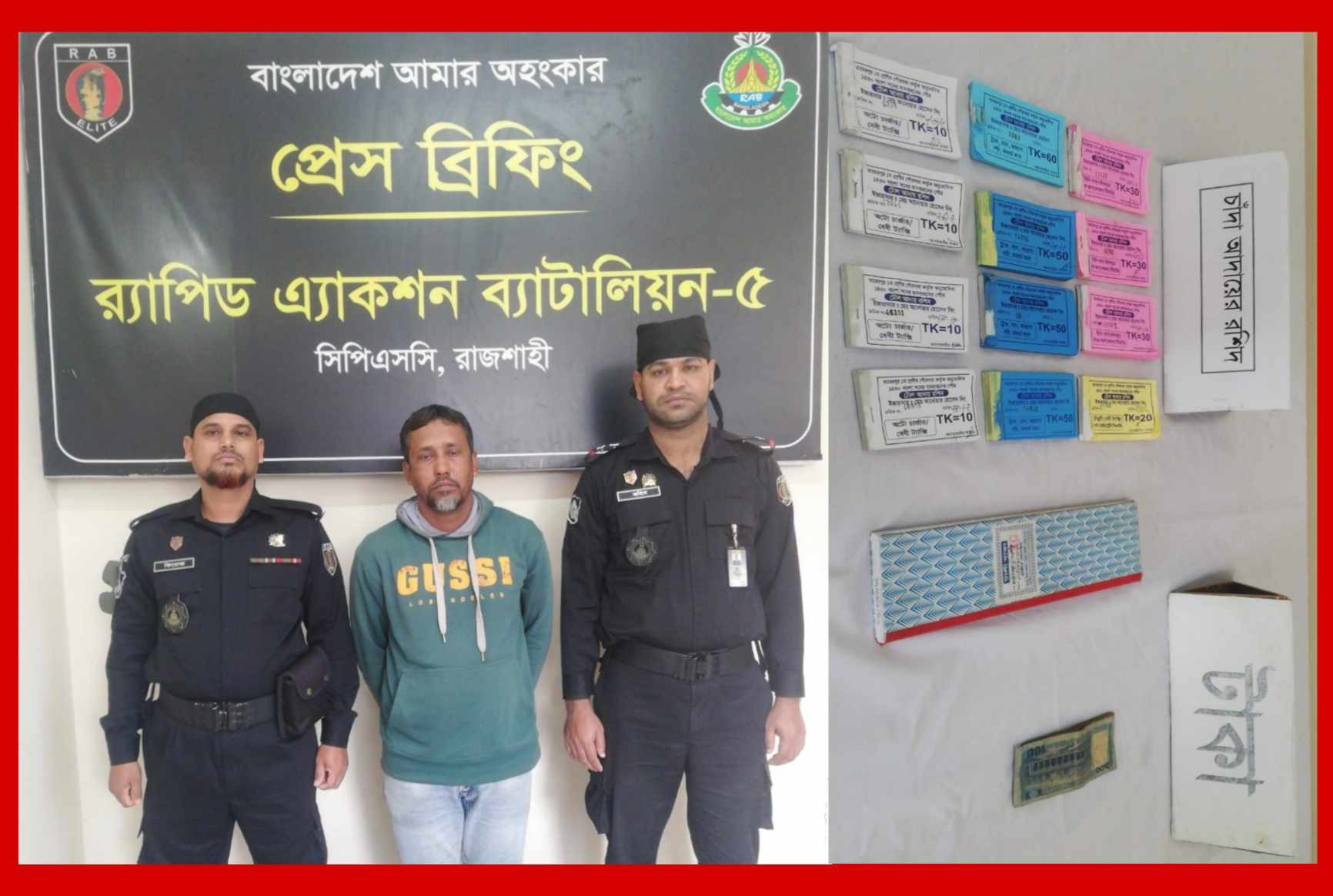 অভিযান চলাকালীন সময়ে গ্রেফতারকৃত আসামী বজলুর রশিদের হেফাজত হতে যথাক্রমে, (ক) চাঁদা আদায়ের রশিদ, (খ) ভাউচার, (গ) টোকেন, (ঘ) চাঁদা বাবদ উত্তোলিত নগদ সর্বমোট ৩৫০/- (তিনশত পঞ্চাশ টাকা) জব্দ করা হয়েছে।