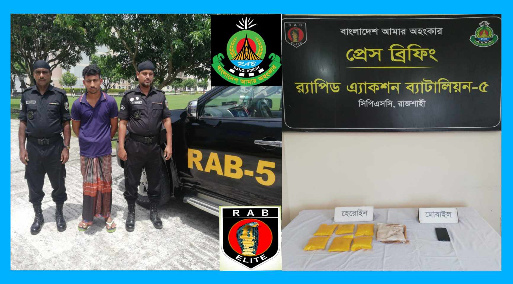 উল্লেখ্য, উপরোক্ত ঘটনায় র্যাপিড এ্যাকশন ব্যাটালিয়ন (র্যাব) এর বিরতিহীন চলমান অভিযানে ০১ কেজি ১০০ গ্রাম হেরোইন উদ্ধার তথা ০১ মাদক ব্যবসায়ীকে গ্রেফতারের বিষয়টি আজ সোমবার (২৮-শে আগষ্ট, ২০২৩ ইং) সিপিসি র্যাব-৫, কতৃক ই-মেইল যোগে প্রেস বিজ্ঞপ্তির মাধ্যমে এই গণমাধ্যম কর্মীকে নিশ্চিত করা হয়েছে।