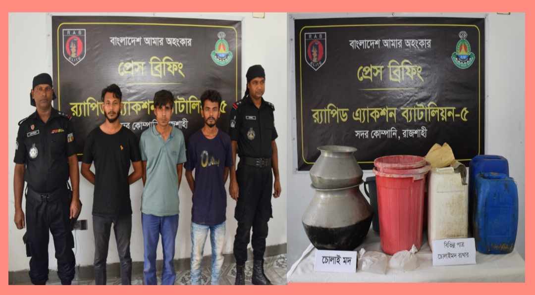 অভিযানে গ্রেফতারকৃত আসামী হলো- ১/ মোঃ মিনহাজুল ওরফে কলিন্স (২৫), পিতা- মোঃ তজিমউদ্দিন, সাং- বাটিকামারী (পুঠিমারী), ২/ মোঃ মুকুল (৩০), পিতা- মৃত মোকছেদ প্রামাণিক, সাং- গুইয়াবাড়ী, ৩/ মোঃ মোরছালিন (২৪), পিতা- মৃত সাহাবুদ্দিন, সাং- বাটিকামারী, সর্বথানা- চারঘাট, জেলা- রাজশাহী। আসামীদের নিকট হইতে ৫৫০ লিটার চোলাইমদ উদ্ধার করতে সক্ষম হন।