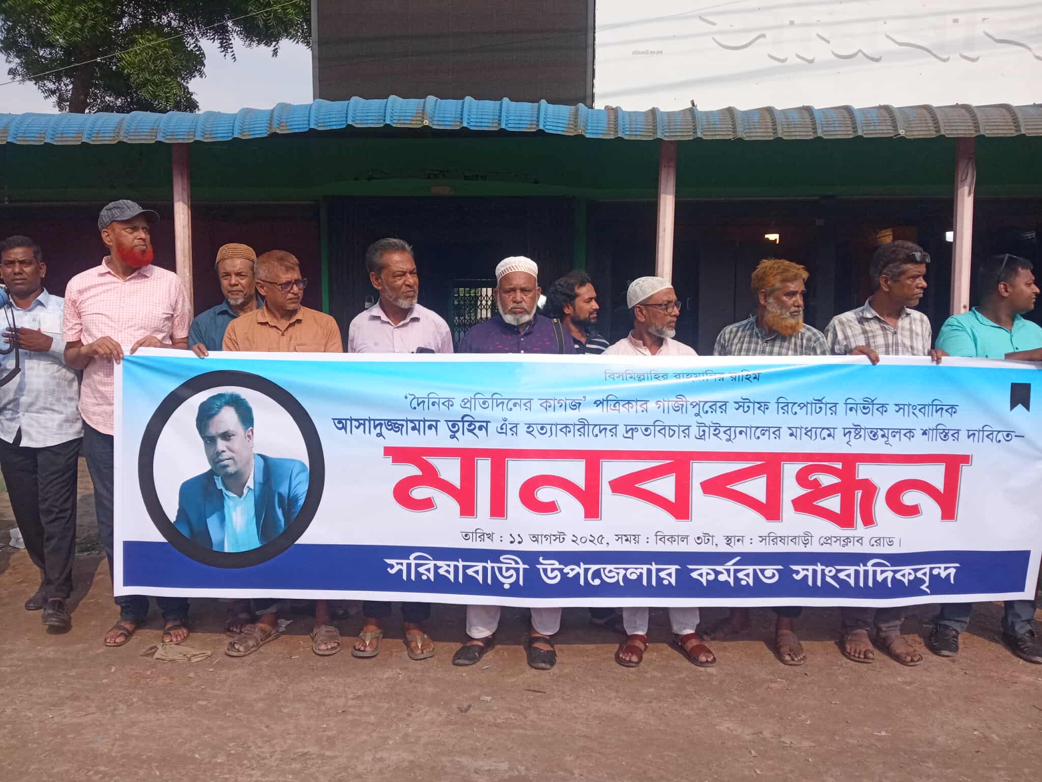 গাজীপুরে সাংবাদিক আসাদুজ্জামান তুহিন হত্যার প্রতিবাদ এবং হত্যাকারীদের দৃষ্টান্তমূলক শাস্তির দাবিতে জামালপুর সরিষাবাড়ীতে মানববন্ধন অনুষ্ঠিত হয়েছে ।