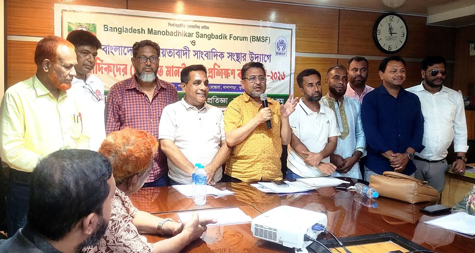 সাংবাদিকতার পেশাগত উৎকর্ষ, নৈতিকতা চর্চা ও আধুনিক গণমাধ্যমের বহুমাত্রিক চ্যালেঞ্জ মোকাবিলায় কুষ্টিয়ায় অনুষ্ঠিত হলো এক ব্যতিক্রমধর্মী ও সময়োপযোগী প্রশিক্ষণ কর্মশালা। দেশের গণমাধ্যম অঙ্গনে গুণগত সাংবাদিকতা চর্চাকে আরও সমৃদ্ধ করতে বাংলাদেশ মানবাধিকার সাংবাদিক ফোরাম (বিএমএসএফ) ও বাংলাদেশ জাতীয়তাবাদী সাংবাদিক সংস্থার যৌথ উদ্যোগে শনিবার (২৫ এপ্রিল) শহরের থানাপাড়াস্থ খেয়া রেস্তোরাঁয় আয়োজন করা হয় “সাংবাদিকদের পেশাগত মানউন্নয়নে প্রশিক্ষণ কর্মশালা-২০২৬”।দিনব্যাপী এ কর্মশালা পরিণত হয় জ্ঞান, অভিজ্ঞতা ও পেশাগত দক্ষতা বিনিময়ের এক প্রাণবন্ত মিলনমেলায়। জেলার প্রিন্ট, অনলাইন ও ইলেকট্রনিক মিডিয়ার সাংবাদিকদের স্বতঃস্ফূর্ত অংশগ্রহণে আয়োজনে সৃষ্টি হয় উৎসবমুখর পরিবেশ। সাংবাদিকতার মানোন্নয়ন, দায়িত্বশীল সংবাদ পরিবেশন এবং প্রযুক্তিনির্ভর নতুন ধারার রিপোর্টিং নিয়ে আলোচনায় উঠে আসে সময়ের গুরুত্বপূর্ণ নানা দিক।