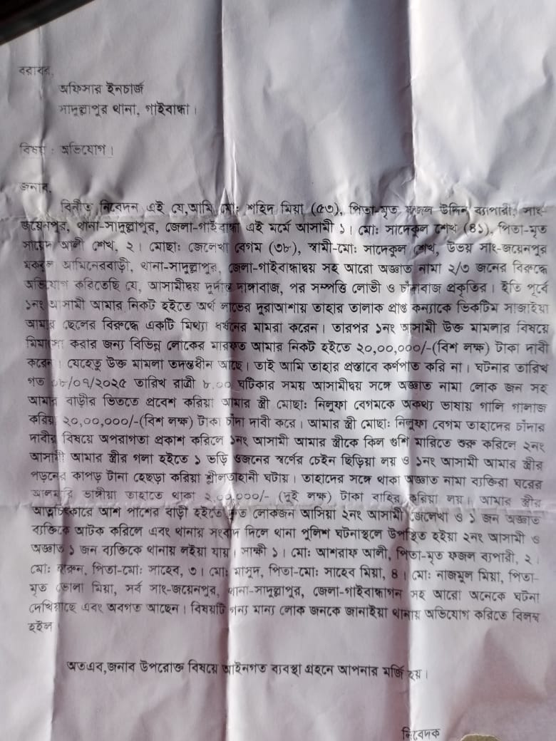 এ ঘটনায় সাদুল্লাপুর থানায় লিখিত অভিযোগ দায়ের করেছে ভুক্তভোগী পরিবার। পুলিশ বলছে, অভিযোগ খতিয়ে দেখা হচ্ছে এবং প্রয়োজনীয় আইনগত পদক্ষেপ নেওয়া হবে।