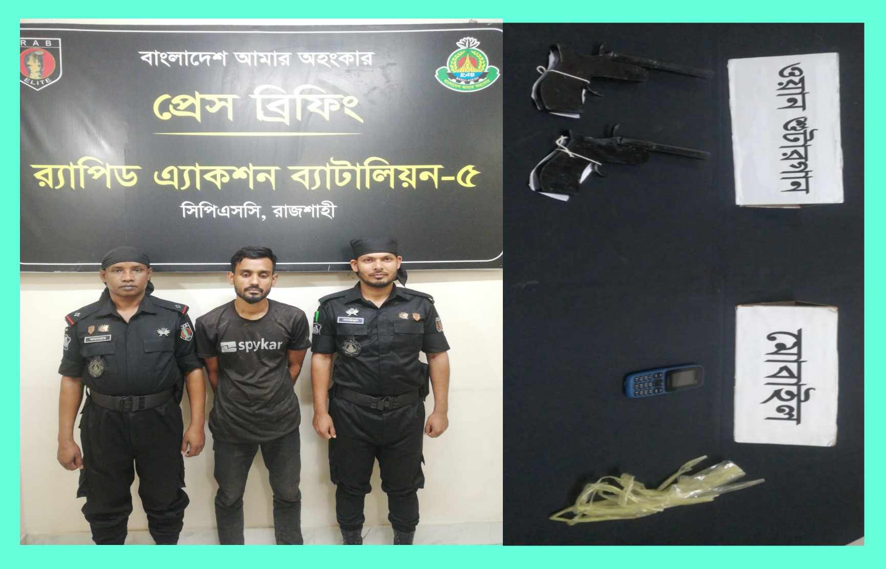 এরই ধারাবাহিকতায় সিপিএসসি, র্যাব-৫, রাজশাহীর একটি আভিযানিক দল ২৯ মার্চ ২০২৪ ইং তারিখ রাত্রী-১৯.৩০ ঘটিকায় রাজশাহী জেলার পুঠিয়া থানাধীন শিবপুর হাট নামক এলাকায় অপারেশন পরিচালনা করেন। ওই সময় যথাক্রমে, ওয়ান শুটারগান- ০২টি, মোবাইল ফোন- ০১টি, সীমকার্ড- ০১টি উদ্ধার করা হয়েছে। অভিযানে গ্রেফতারকৃত আসামী হলো- মোঃ শাকিব (৩২), পিতা- মোঃ সিরাজুল ইসলাম, সাং- হলিদাগাছী, থানা- চারঘাট, জেলা- রাজশাহী।