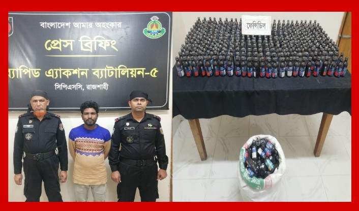 উল্লেখ্য, উপরোক্ত ঘটনায় র্যাপিড এ্যাকশন ব্যাটালিয়ন (র্যাব) এর বিরতিহীন চলমান অভিযানে সিপিএসসি, র্যাব-৫ কতৃক অভিযান চালিয়ে রাজশাহীর বাঘা থানা এলাকা হতে ৫০২ বোতল ফেন্সিডিল উদ্ধার পূর্বক ০১ মাদক ব্যবসায়ীকে গ্রেফতারের বিষয়টি আজ রোববার (২৫ ফ্রেব্রুয়ারী, ২০২৪ ইং) সিপিসি র্যাব-৫, কতৃক ই-মেইল যোগে প্রেস বিজ্ঞপ্তির মাধ্যমে এই গণমাধ্যম কর্মীকে নিশ্চিত করা হয়েছে।