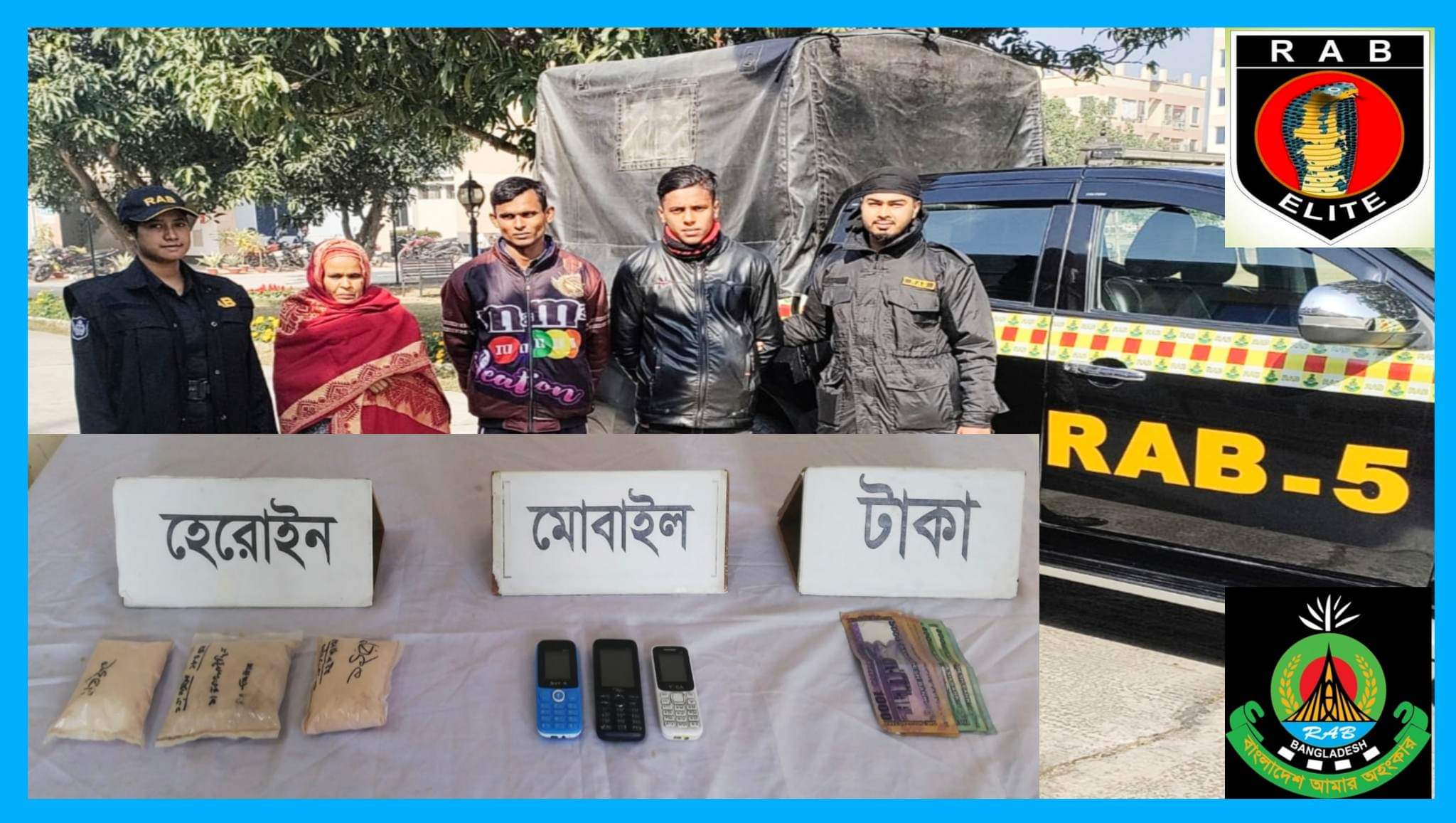 ঘটনার বিবরণে প্রকাশ : গোয়েন্দা তথ্যের ভিত্তিতে র্যাব-৫, রাজশাহীর সিপিএসসি, মোল্লাপাড়া ক্যাম্পের একটি অপারেশন দল জানতে পারে যে, কতিপয় মাদক ব্যবসায়ী মাদকদ্রব্যসহ যাত্রীবেশে রাজশাহী রেলস্টেশনের সম্মুখভাগে অবস্থান করছে। এরই প্রেক্ষিতে ঘটনাস্থল রাজশাহী মহানগরীর বোয়ালিয়া থানাধীন রাজশাহী রেলওয়ে স্টেশনের রেলওয়ে বাউন্ডারীর উত্তর পার্শ্বে গাড়ী পার্কিং এলাকায় পুর্ব-পশ্চিম লম্বা-লম্বি ওয়াল সংলগ্ন দুই ল্যাম্প পোষ্টের মাঝ বরাবর স্থানে পোঁছামাত্রই র্যাবের উপস্থিতি টের পেয়ে কৌশলে পালানোর চেষ্টাকালে ঘটনাস্থলেই ০২জন পুরুষ ব্যক্তিকে এবং নারী র্যাব সদস্যের সহায়তায় ০১জন মহিলাকে আটক করতে সক্ষম হন।
