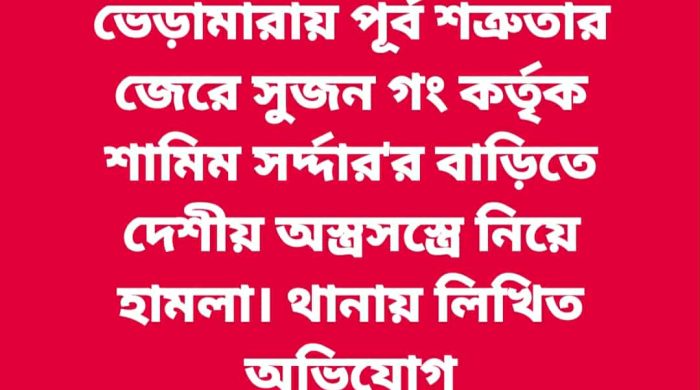 ভেড়ামারা প্রতিনিধি – কুষ্টিয়ার ভেড়ামারায় প্রেম ঘটিত বিষয় নিয়ে পূর্ব শত্রুতার জেরে জাকারিয়া হোসেন সুজন গং কর্তৃক শামিম সর্দ্দার’র বাড়িতে দেশীয় অস্ত্রেসস্ত্র নিয়ে হামলা করেন বলে লিখিত অভিযোগ পাওয়া গেছে।
