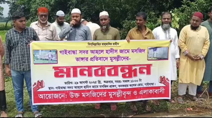 মোঃ মিঠু মিয়া গাইবান্ধা জেলা প্রতিনিধি: গাইবান্ধায় যুবলীগ নেতা কর্তৃক মসজিদ ভাঙচুরের অভিযোগে মুসল্লী ও এলাকাবাসীর আয়োজনে মানববন্ধন অনুষ্ঠিত হয়েছে। শুক্রবার দুপুরে সদর উপজেলার নাকাইহাট–গাইবান্ধা সড়কের কনকরায় আহলে হাদীস জামে