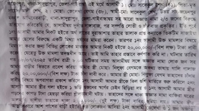 মোঃ মিঠু মিয়া গাইবান্ধা জেলা প্রতিনিধি গাইবান্ধার সাদুল্লাপুর উপজেলার বনগ্রাম ইউনিয়নের জয়েনপুর গ্রামে ডাকাতি ও শ্লীলতাহানির অভিযোগ উঠেছে। ভুক্তভোগী পরিবারের অভিযোগ, স্থানীয় দুই ব্যক্তি অজ্ঞাতনামা লোকজন নিয়ে তাদের বাড়িতে হামলা